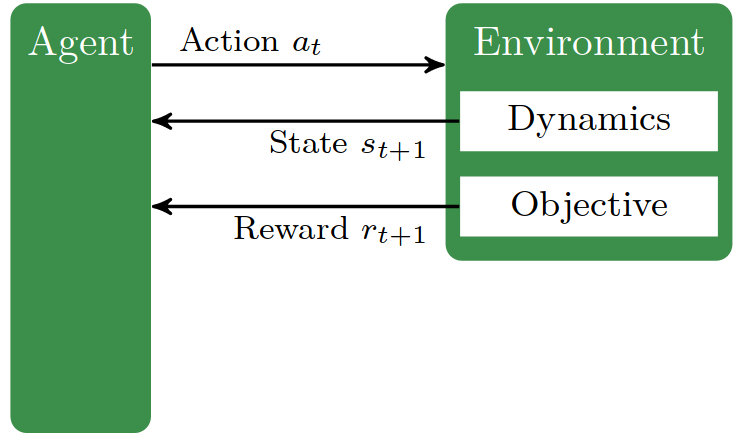 Reinforcement learning is the setting of learning behavior from rewarded interaction with the environment (Sutton & Barto, 2018). It is formalized as a Markov decision process (MDP), which is a model for sequential decision making. It iteratively: